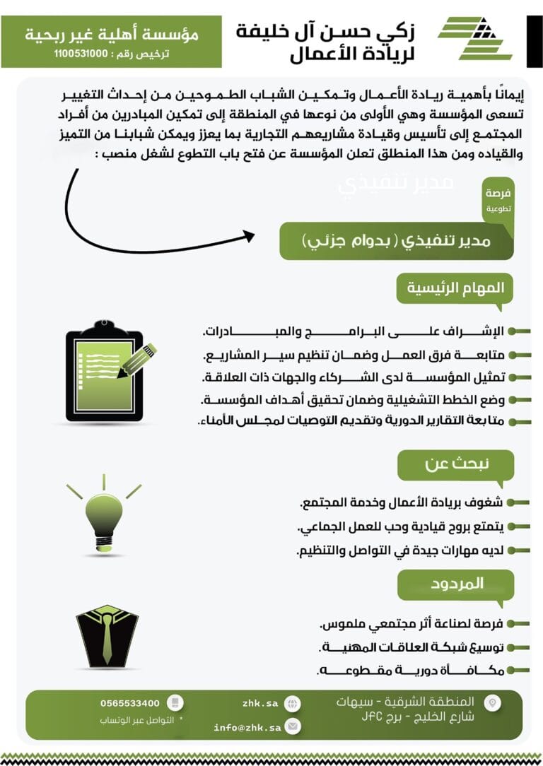 أعلنت مؤسسة زكي حسن آل خليفة لريادة الأعمال — وهي مؤسسة أهلية غير ربحية حاصلة على الترخيص رقم (1100531000)، عن فتح باب التطوع لمنصب مدير تنفيذي بدوام جزئي، في خطوة تعكس رؤيتها في تمكين الشباب الطموح، وتوسيع دائرة المبادرات التي تعزز روح الريادة والخدمة المجتمعية.