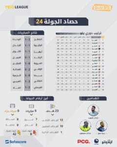 أُسدل الستار على منافسات الجولة الرابعة والعشرين من دوري يلو للمحترفين، والتيجاءت محملة بالإثارة، حيث شهدت الملاعب تسجيل 23 هدفاً؛ تقاسمها اللاعبونالأجانب بـ 13 هدفاً والمحليون بـ 10 أهداف. وواصل نادي أبها فرض هيمنته المطلقةعلى القمة بعد تعادله مع الأنوار (1-1)، ليصل للنقطة 61 ويوسع الفارق مع ملاحقيه،مستنداً إلى صلابة دفاعية جعلته الأقوى في الدوري باستقباله 19 هدفاً فقط.